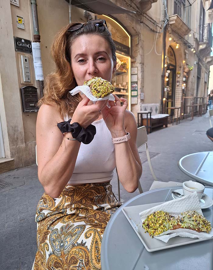 I know, guys. Sugar isn’t healthy, and we’re all aware of its evil side. But if, like us, you manage to clock between 15,000 and 22,000 steps daily on a 4-day trip in East Sicily, you’ve earned it! And why settle for a small indulgence when you can go big and get yourself an amazing cannoli, filled with pistachio cream and sprinkled with actual pistachios? No excuses if you’re gluten-free either – they’ve got you covered!