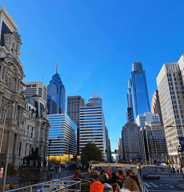I know, it doesn’t get more “tourist attraction” than this — but honestly, hopping on the City Sightseeing bus is one of the best ways to explore Philly! We tried it, and it turned out to be a fantastic experience. Even though the weather was windy, we grabbed seats on the open-top deck of the double-decker bus. It was a little chilly, but the panoramic views of the city were absolutely worth it.